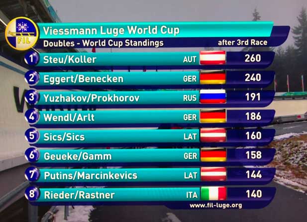 Lagen sie doch nach dem ersten Durchgang und praktisch bis vor der letzten Kurve im zweiten Durchgang noch auf „grün“ in Führung, war es am Ende doch „nur“ Platz vier und Blech in der Gesamtabrechnung. Thomas Steu und Lorenz Koller behielt aber dank den beiden Erfolgen beim Saisonauftakt auf ihrer Heimbahn in Innsbruck-Igls mit 260 Punkten die Führung in der Gesamtwertung vor Eggert/Benecken (240) und den Russen Vladislav Yuzhakov/Iurii Prokhorov (191), die in Whistler auf Rang zehn ins Ziel kamen.