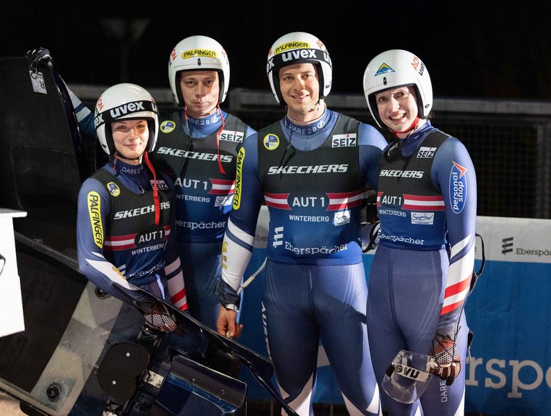 Zum Auftakt des Weltcups in Winterberg sicherte sich unser Team Austria im Mixed-Doppelbewerb gleich den ersten Podestplatz. Steu/Kindl und Egle/Kipp mussten sich dabei lediglich den deutschen Duos Wendl/Arlt sowie Degenhardt/Rosenthal geschlagen geben. Nur hauchdünn – um 0,08 Sekunden – verpassten Austria 1 mit Yannick Müller/Armin Frauscher gemeinsam mit den jungen Lina Riedl/Anna Lerch das Stockerl und landeten auf Rang vier. „Mit dem Ergebnis sind wir grundsätzlich zufrieden. Natürlich ist es schade, dass es nicht fürs Podest gereicht hat, vor allem, weil heute kein Team einen perfekten Lauf gezeigt hat. Für morgen sind wir jedenfalls topmotiviert und wollen unter die Top drei,“ blickt Armin Frauscher optimistisch auf das anstehende Disziplinrennen.