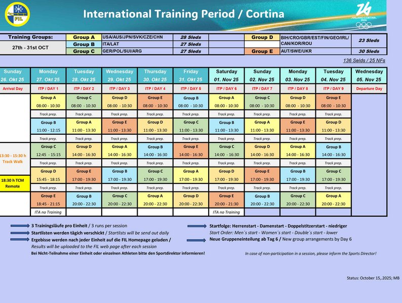 Gestartet wird in fünf Trainingsgruppen, die nach dem sechsten Tag neu zusammengesetzt werden. Bei drei Trainingsläufen pro Einheit und neun Einheiten in knapp zwei Wochen kann jeder maximal 27x den Eugenio Monti Eiskanal testen. Unsere Rodler starten am ersten Tag, am Montag, den 27. Oktober zusammen mit den Schweden und Ukrainern in der Night-Session ab 18:45 Uhr. Dann beginnt auch die interne Olympiaqualifikation für unsere Rodler: Diese ist mit acht Wettkämpfen ausgeschrieben, die mit Punkten bewertet werden. Neben den Leistungen auf der Olympiabahn im Rahmen der internationalen Trainingswoche und des Test-Events im November, fließen auch die ersten sechs Weltcupentscheidungen 2025/2026 in die Bewertung mit ein.